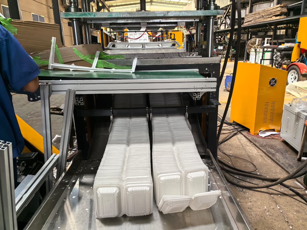 An integrated production plant for foam food containers, relying on automated production lines that include roll production with different thickness levels, followed by thermoforming processes to produce trays in various sizes and shapes. The line includes cutting, forming, cooling, and final packaging stages, in addition to a recycling system to reuse production waste and reduce material loss, improving overall efficiency. The plant offers high flexibility in production, meeting the needs of restaurants, delivery companies, and food markets with consistent quality and low operating costs